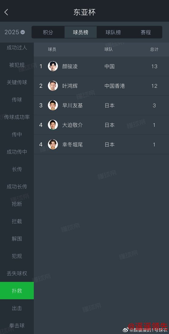 颜骏凌是东亚杯扑救次数最多的门将。